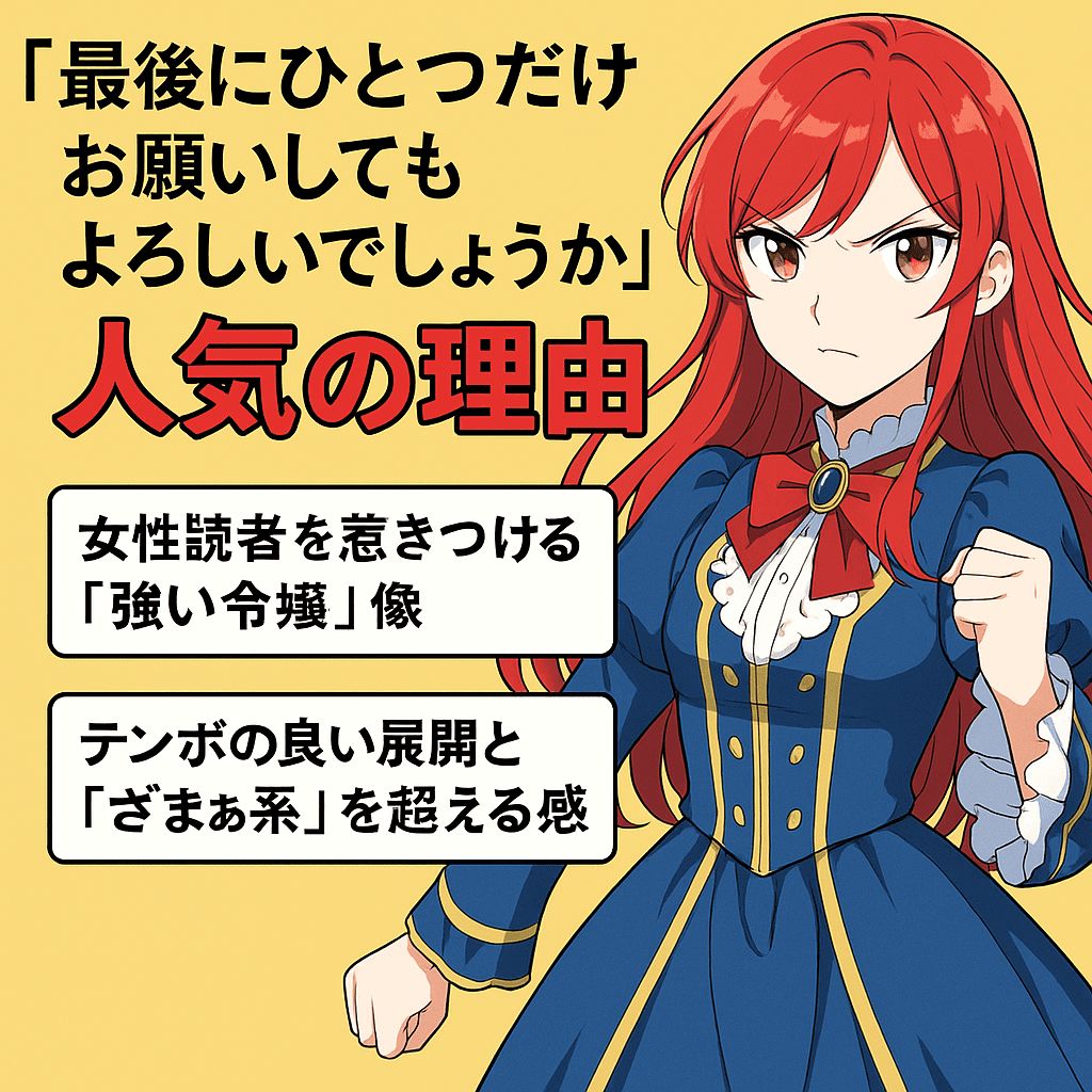 『最後にひとつだけお願いしてもよろしいでしょうか』は、悪役令嬢というジャンルの常識を覆し、拳と信念で運命を切り開くヒロイン像を描いた話題作です。
